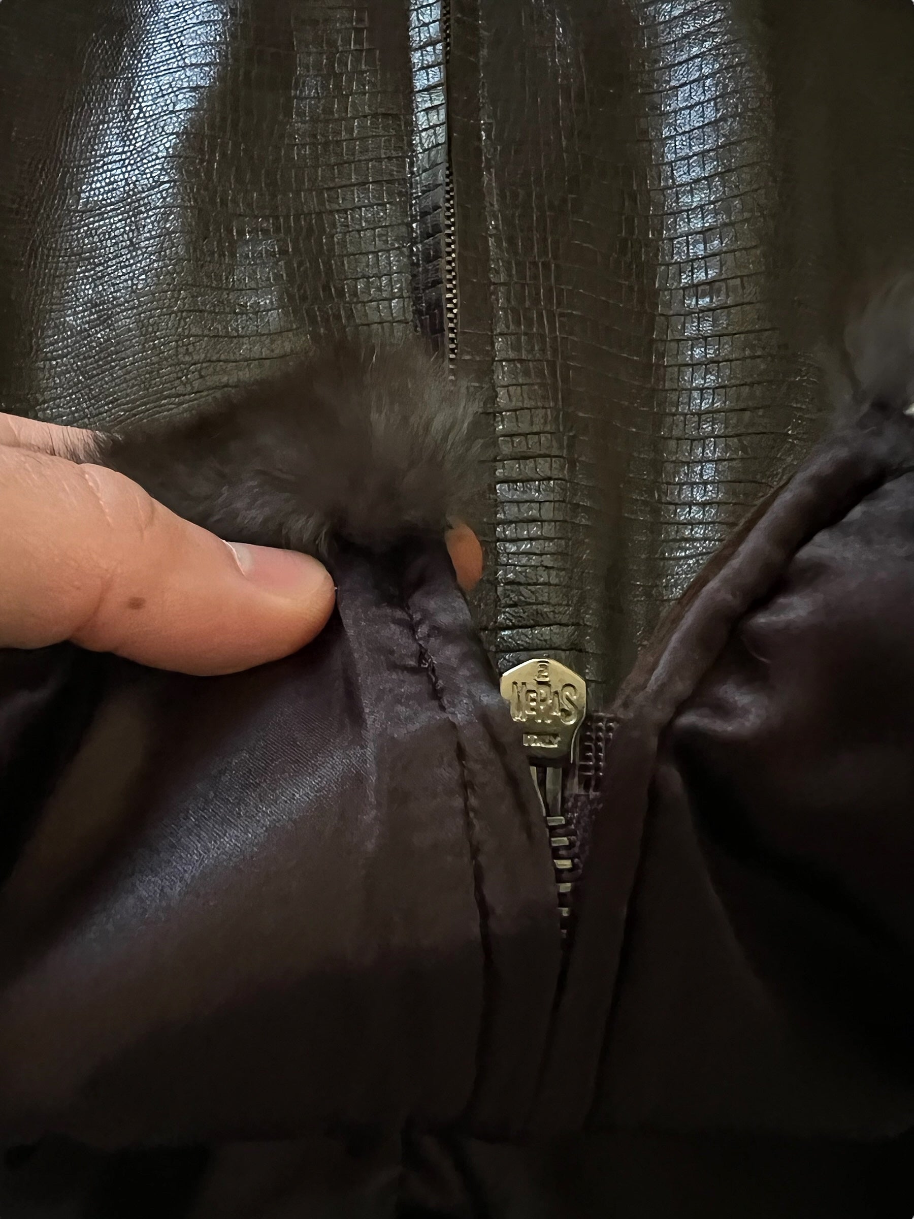 OG 2000's Giorgio Armani mainline featuring an embossed snake skin imprint pattern on shiny leather, lined with satin and rabbit fur collar.